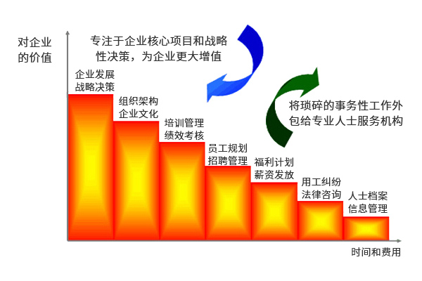 发包方依据公司战略管理的需要,将人员招聘、员工培训、用工备案、薪资核算、社保和住房公积金事务办理、劳动关系管理、劳动争议仲裁与诉讼,后勤管理等人力资源或行政管理体系中的部分事务性业务外包出去,由专业的外包服务公司代理完成,从而实现人力资源部非核心业务的分离,减少繁琐事务,降低人力资源管理成本,提高发包方人力资源管理效率。